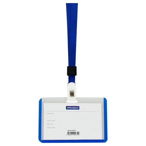 Бейдж горизонтальный 55х90мм OfficeSpace синий на шнурке
