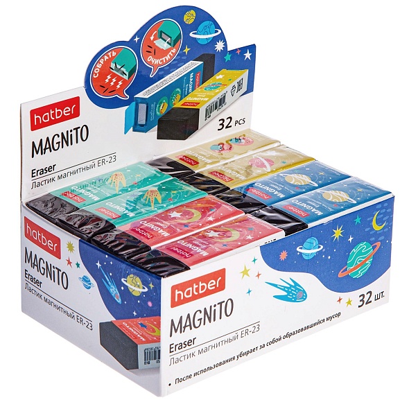 Ластики Magnito отлично справляются с удалением рисунков и надписей, сделанных чернографитными карандашами. Их уникальные свойства сохраняют поверность бумаги чистой после использования. Достаточно провести обратной стороной ластика над катышками, оставленными после стирания, и они все соберутся встроенным магнитом. Отрывная перфорация на чехле позволяет регулировать его размер под ластик, по мере стирания. 4 уникальных дизайна чехла в 4-х цветовых решениях. Каждый ластик имеет штрихкод.