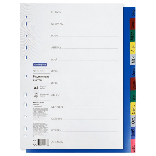 Разделитель листов А4 OfficeSpace 12л Январь-Декабрь цветной пластиковый