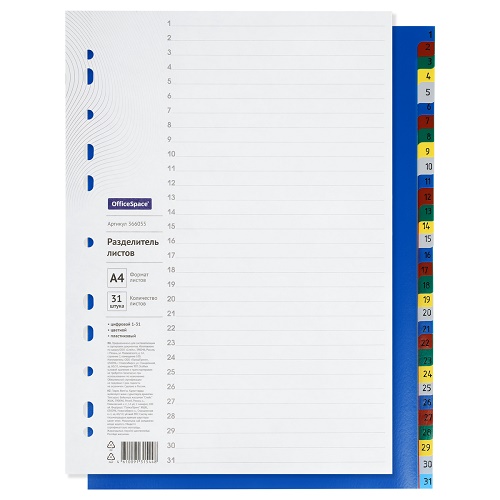 Разделитель листов OfficeSpace А4 31л цифровой 1-31 цветной пластиковый