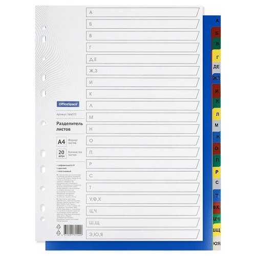Разделитель листов А4 OfficeSpace 20л алфавитный А-Я цветной пластиковый