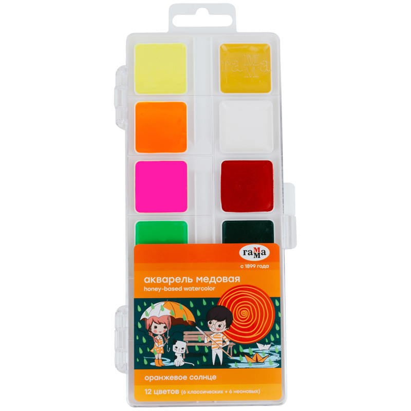 Краски акварельные 12 цв Гамма Оранжевое солнце медовая 6 флуор + 6 классич